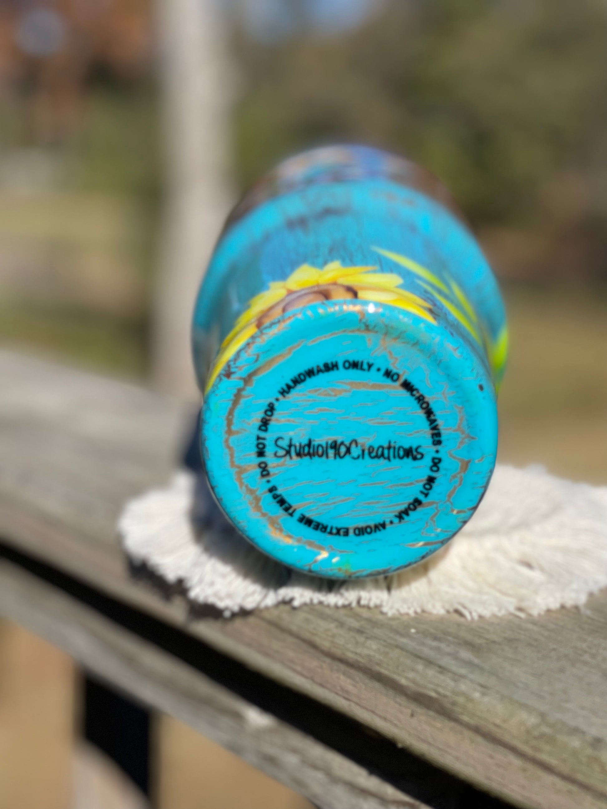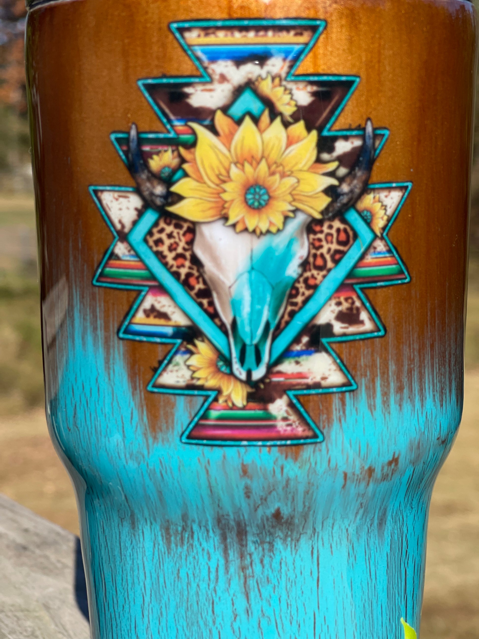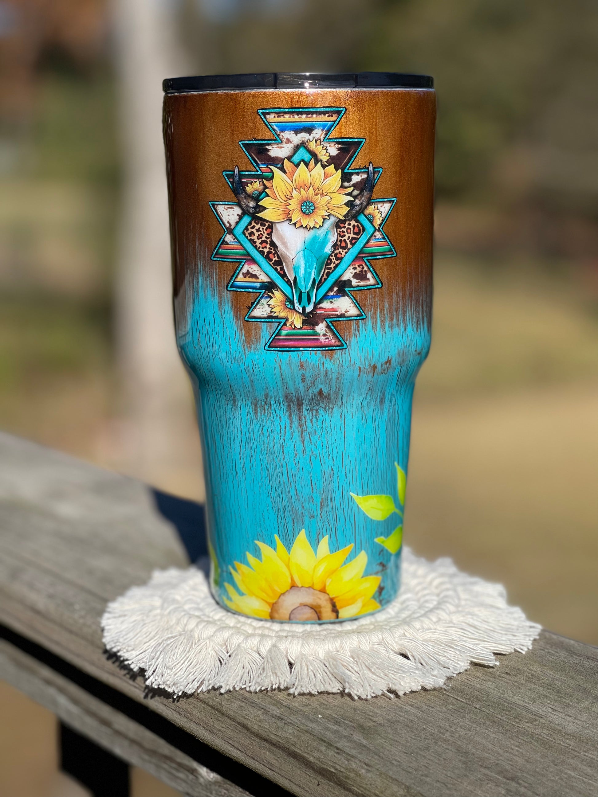 30 ounce standard with a wood grain and teal crackle effect with sunflowers and western decal. Stainless steel tumblers are made for hot or cold beverages.