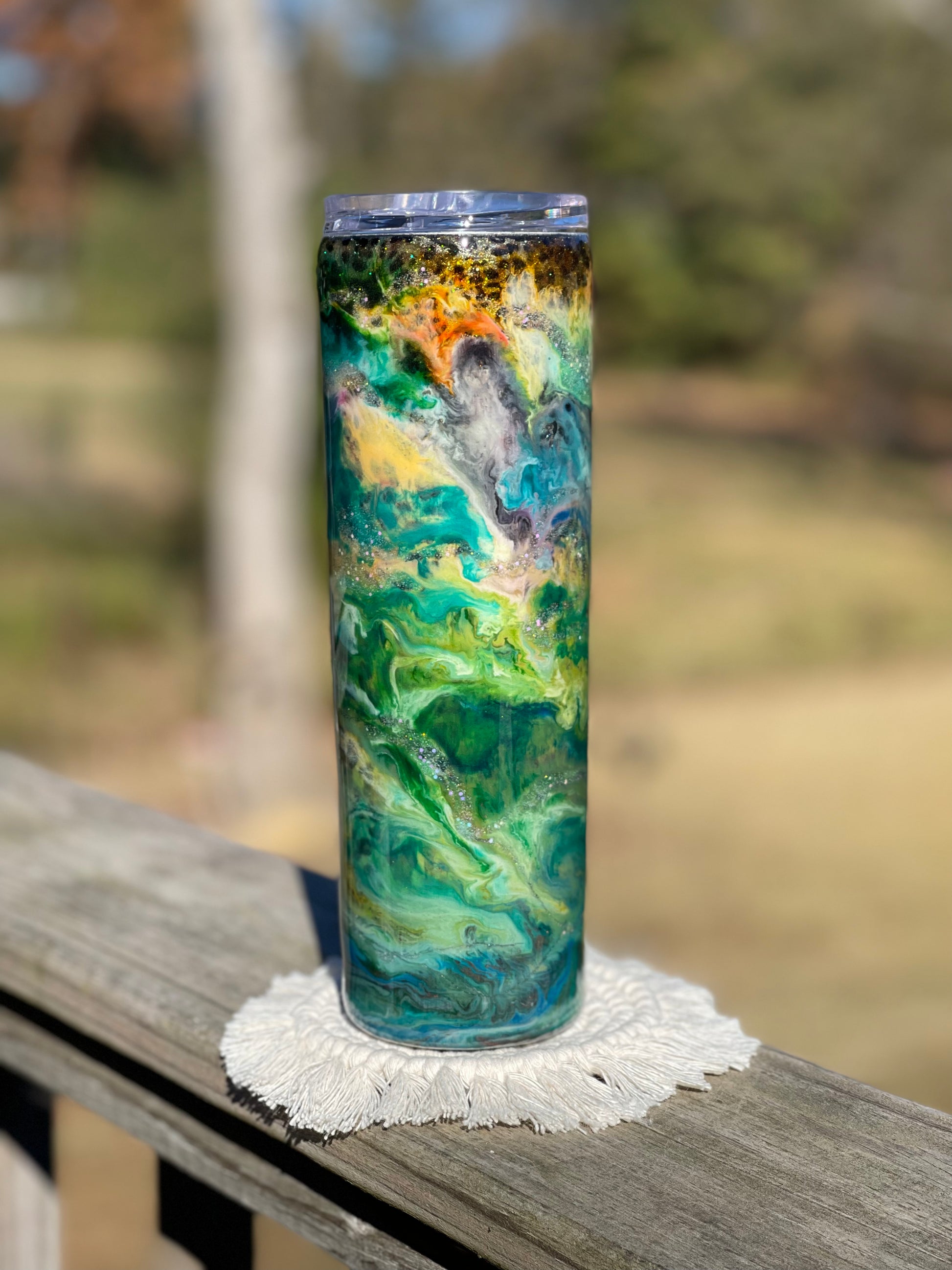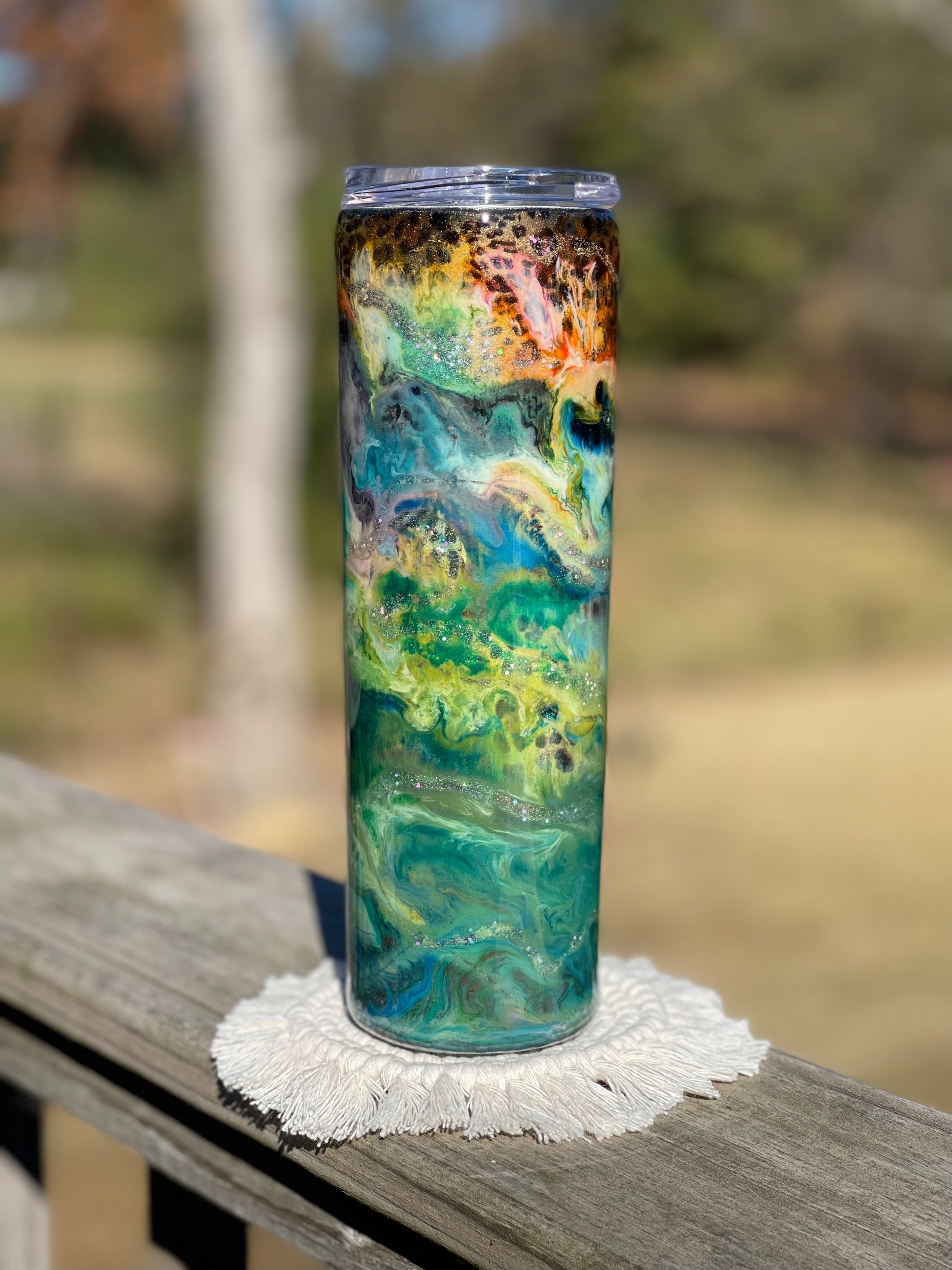 30 ounce skinny stainless steel tumbler with foil and ink swirl design. Double walled stainless steel tumblers are made for hot or cold beverages.