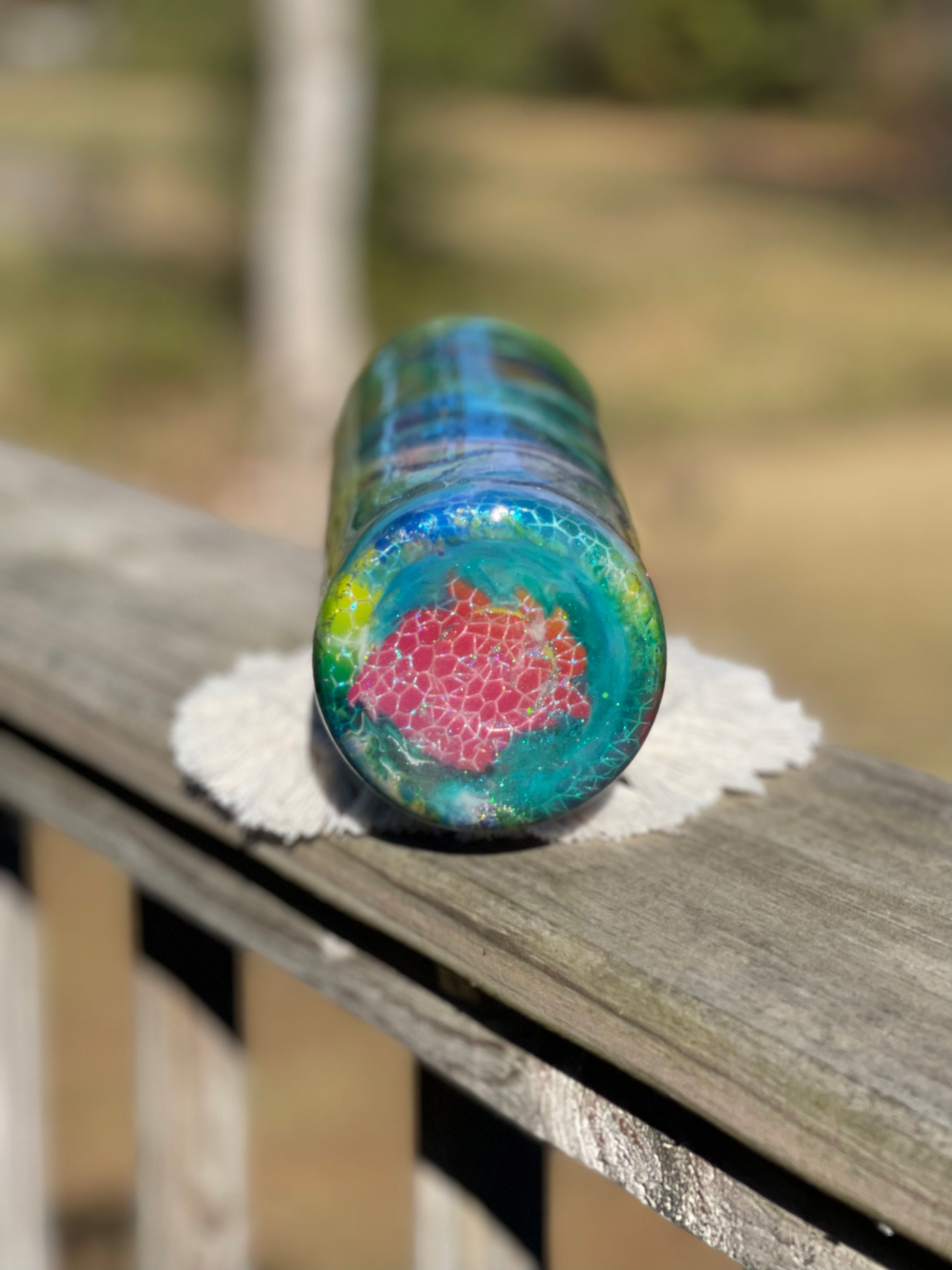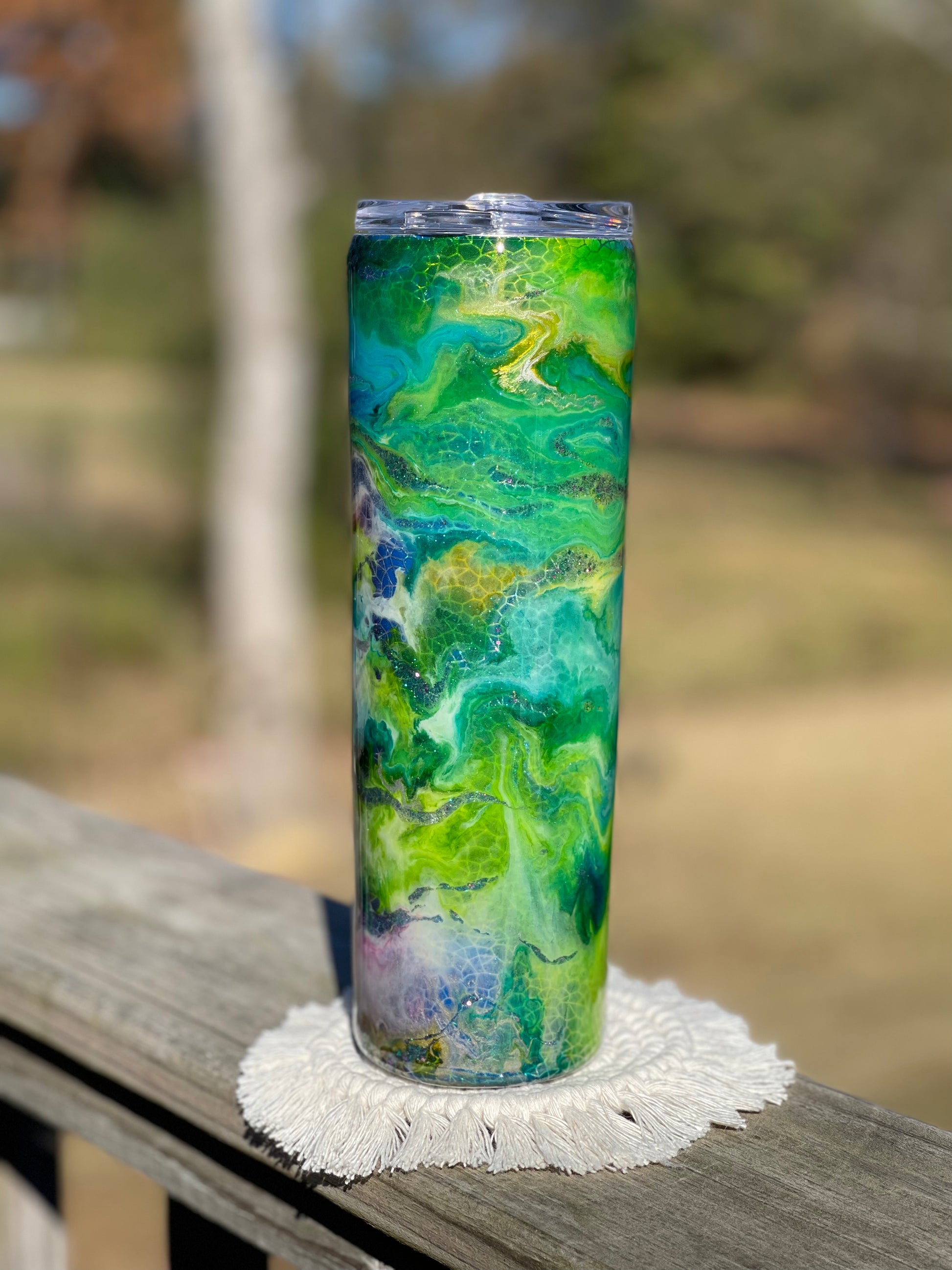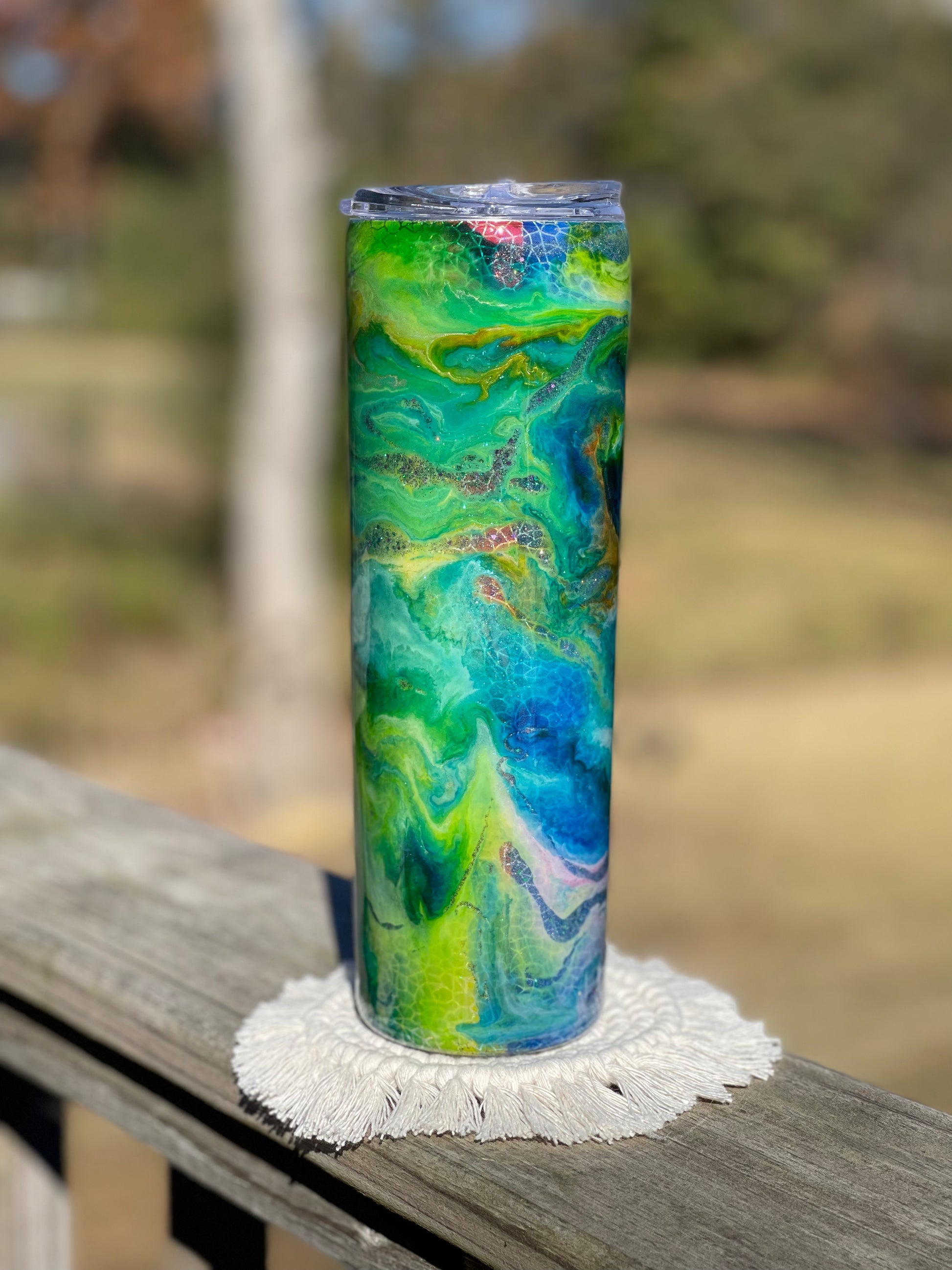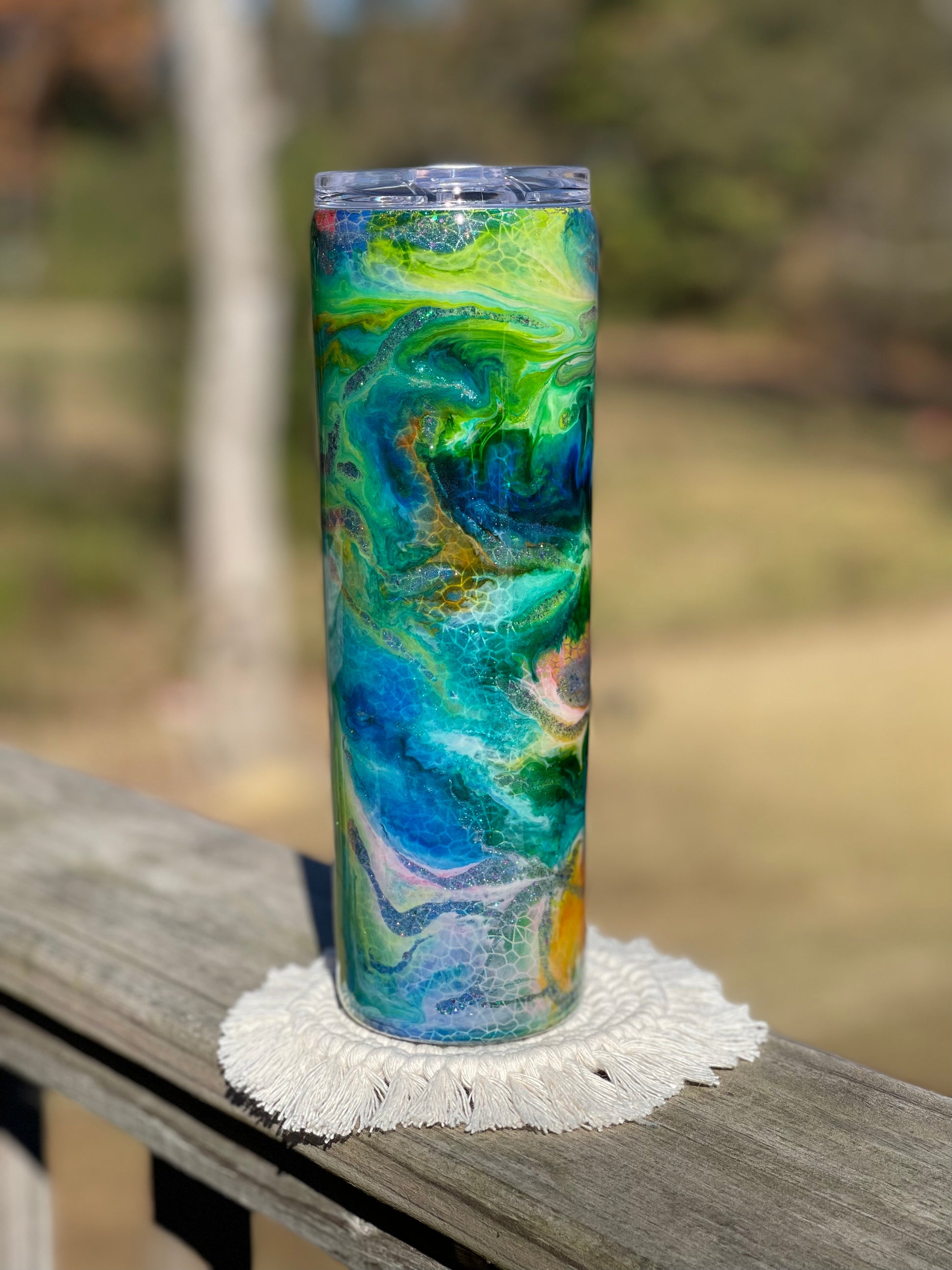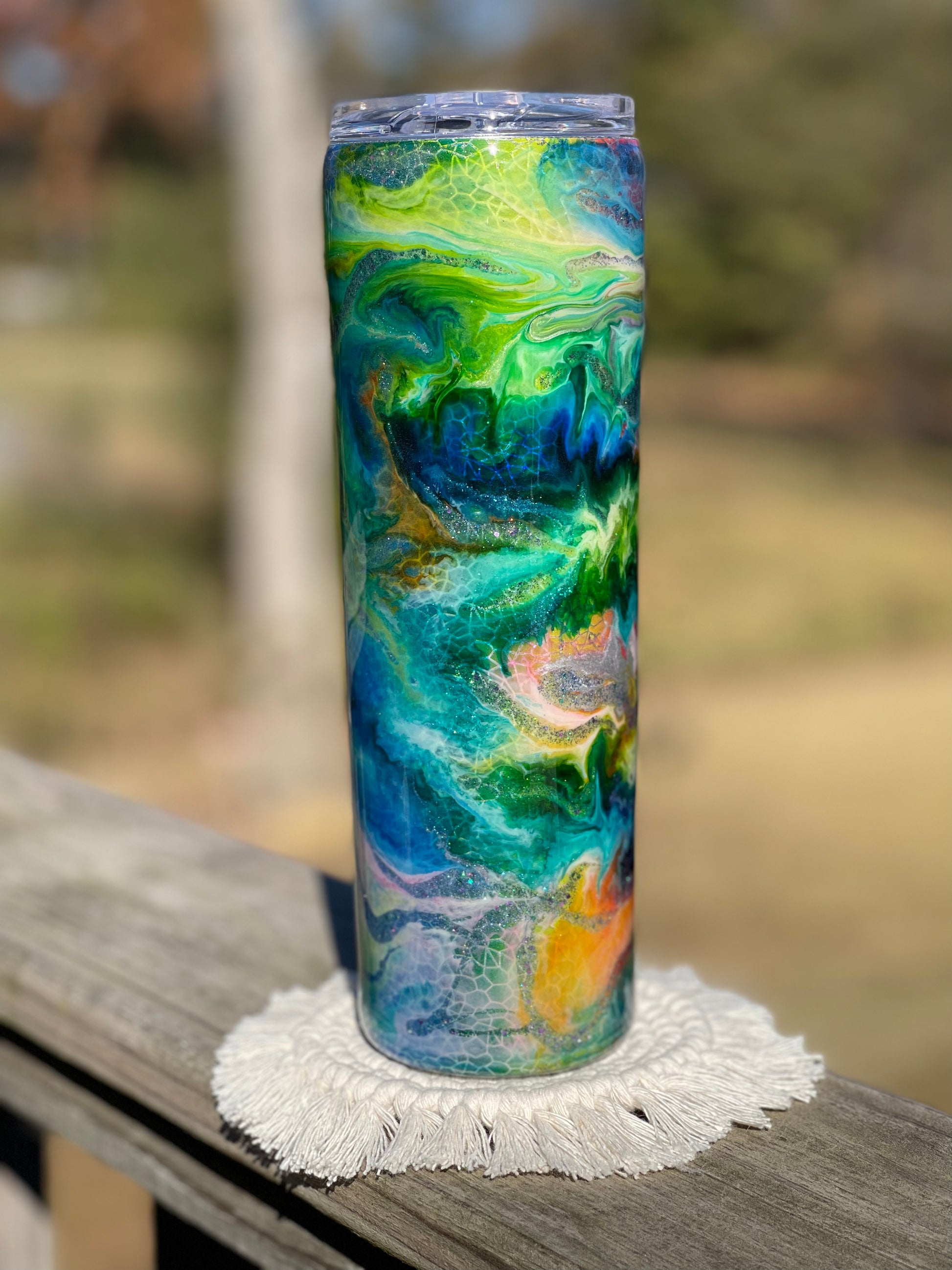 30 ounce skinny stainless steel tumbler decorated with foils and ink swirl. Stainless Steel tumblers are made for hot or cold beverages.