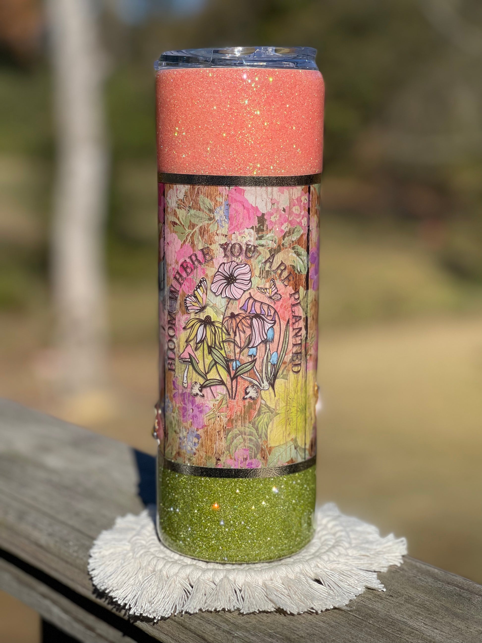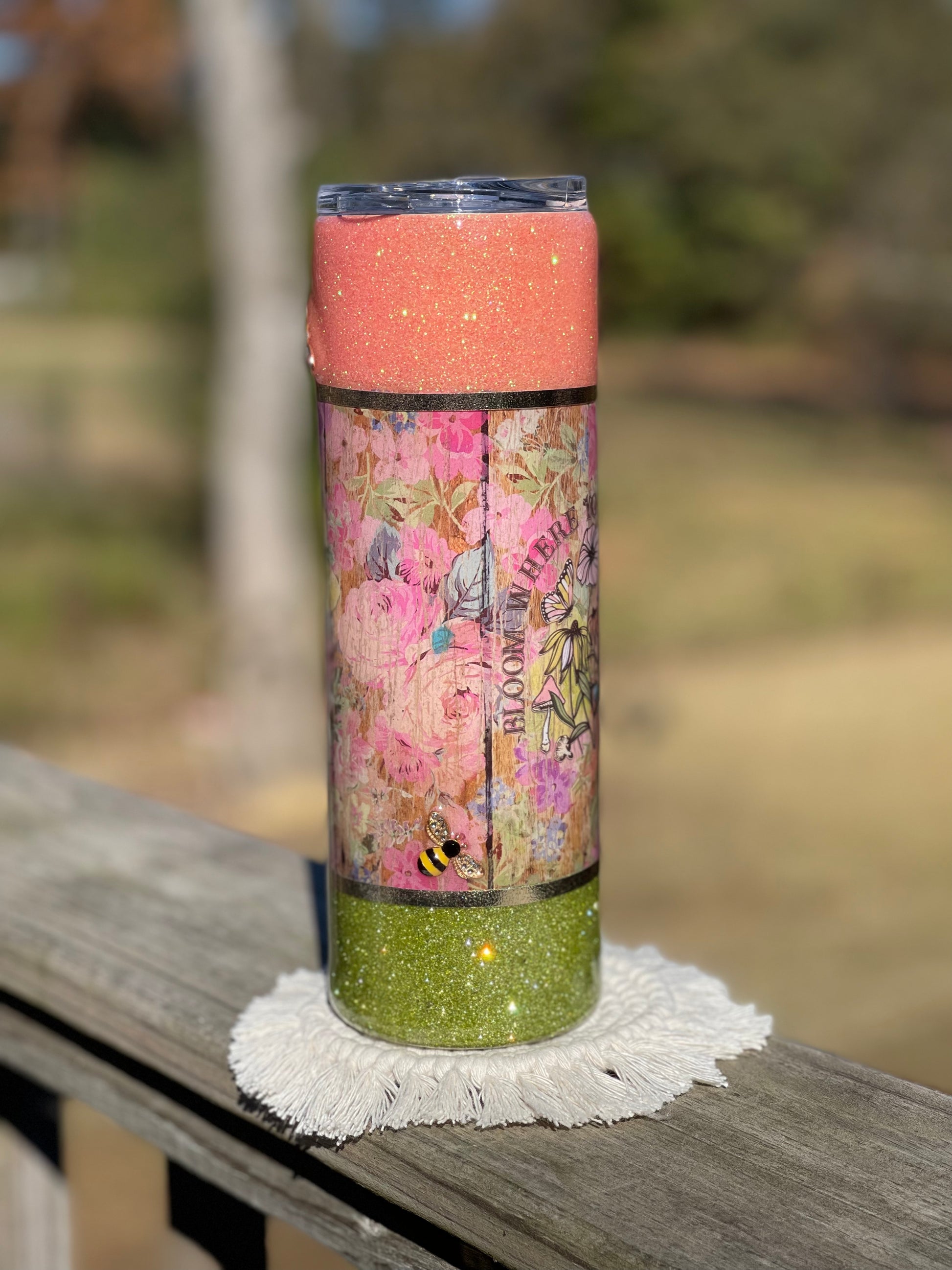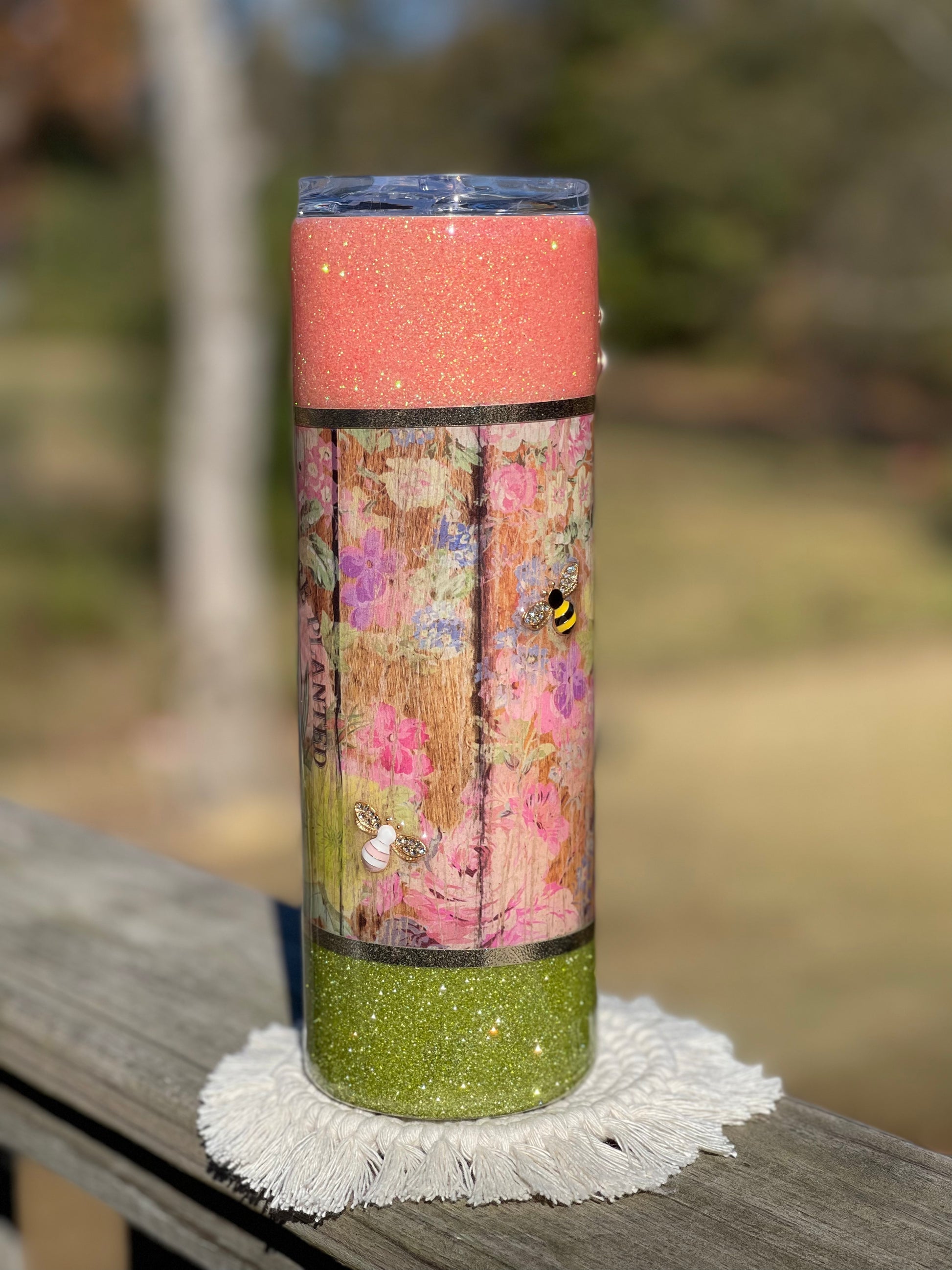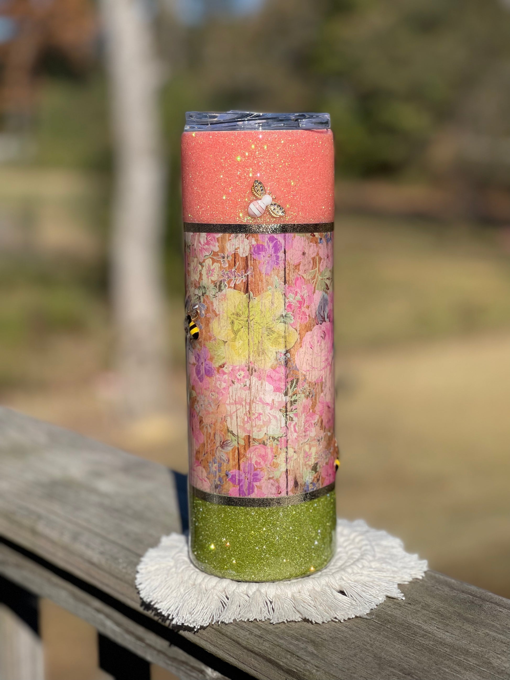 30 ounce skinny stainless steel tumbler with a beautiful floral print and bee accents. Stainless steel tumblers are made for hot or cold beverages.