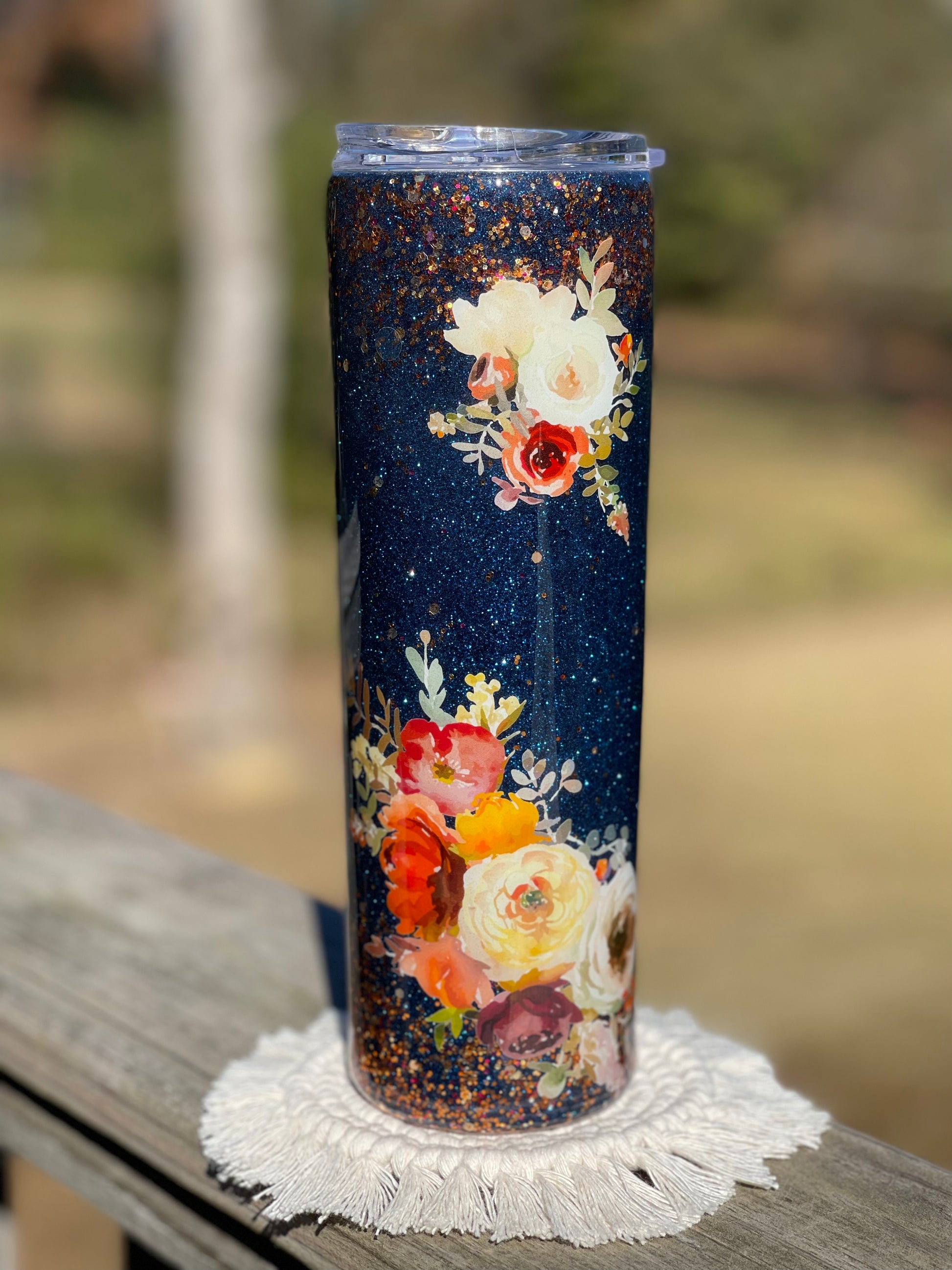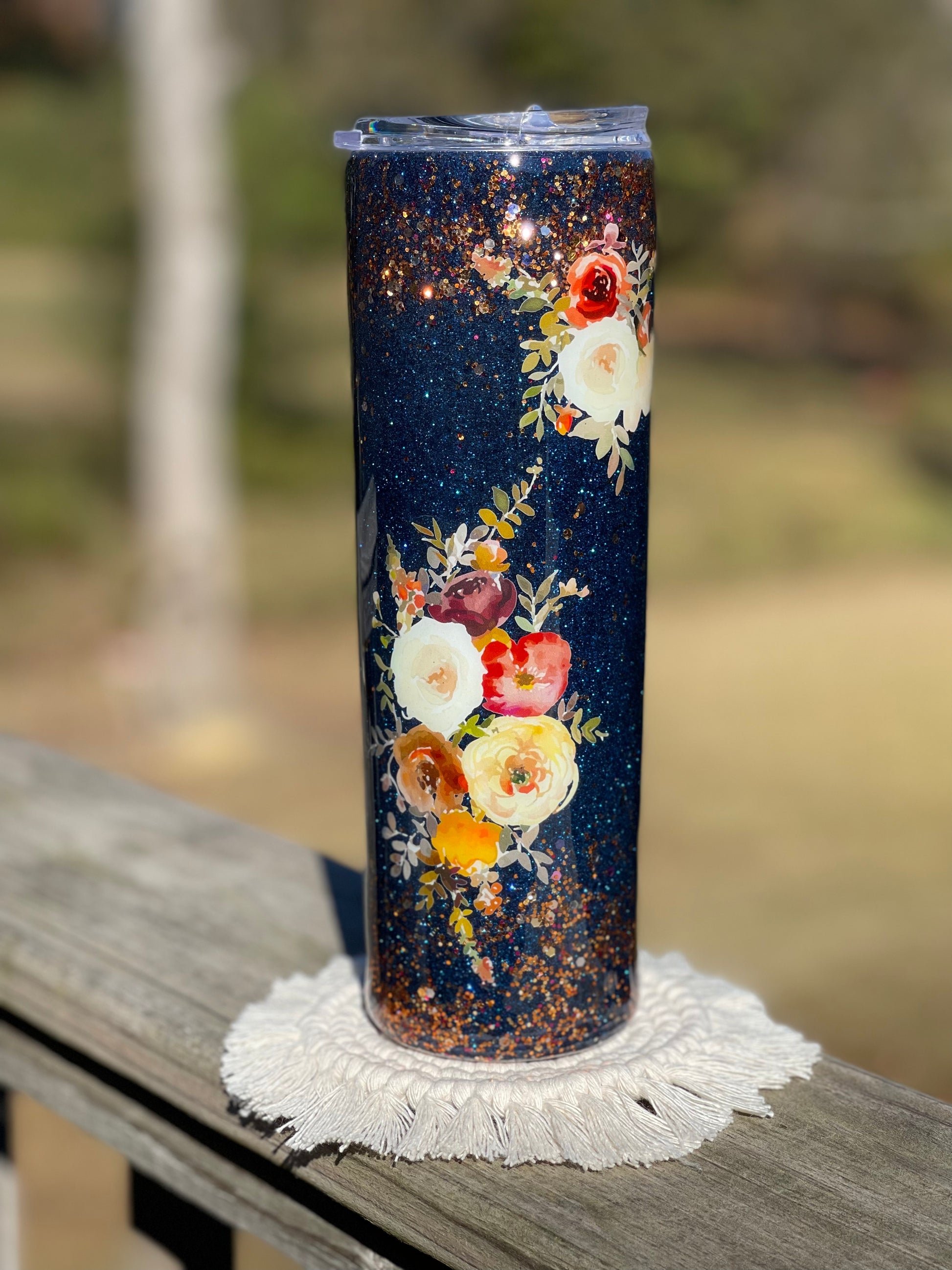 Navy base glittered 30 ounce skinny with cascaded glitter accents and flowers. Stainless steel tumblers are made for hot or cold beverages.