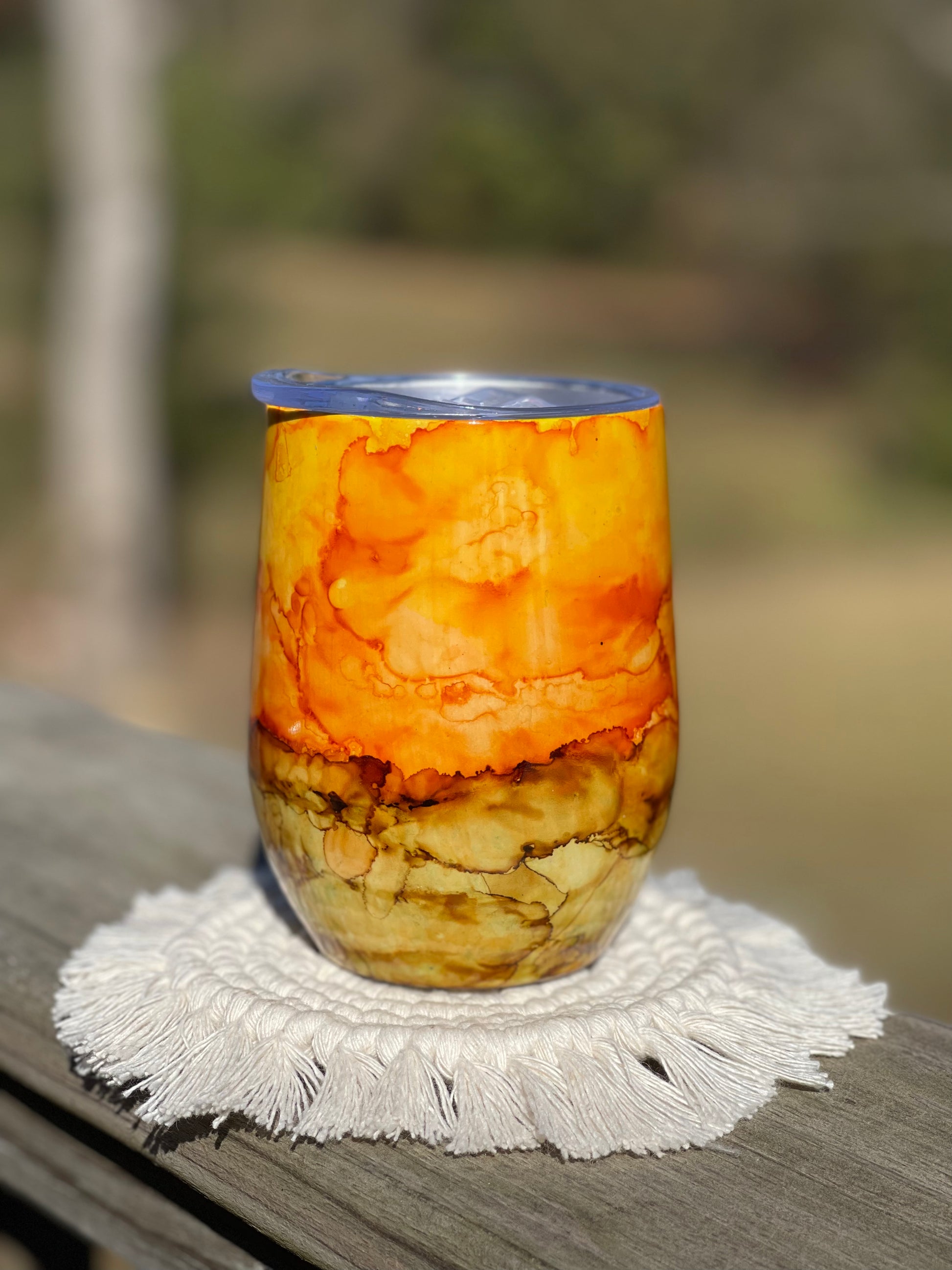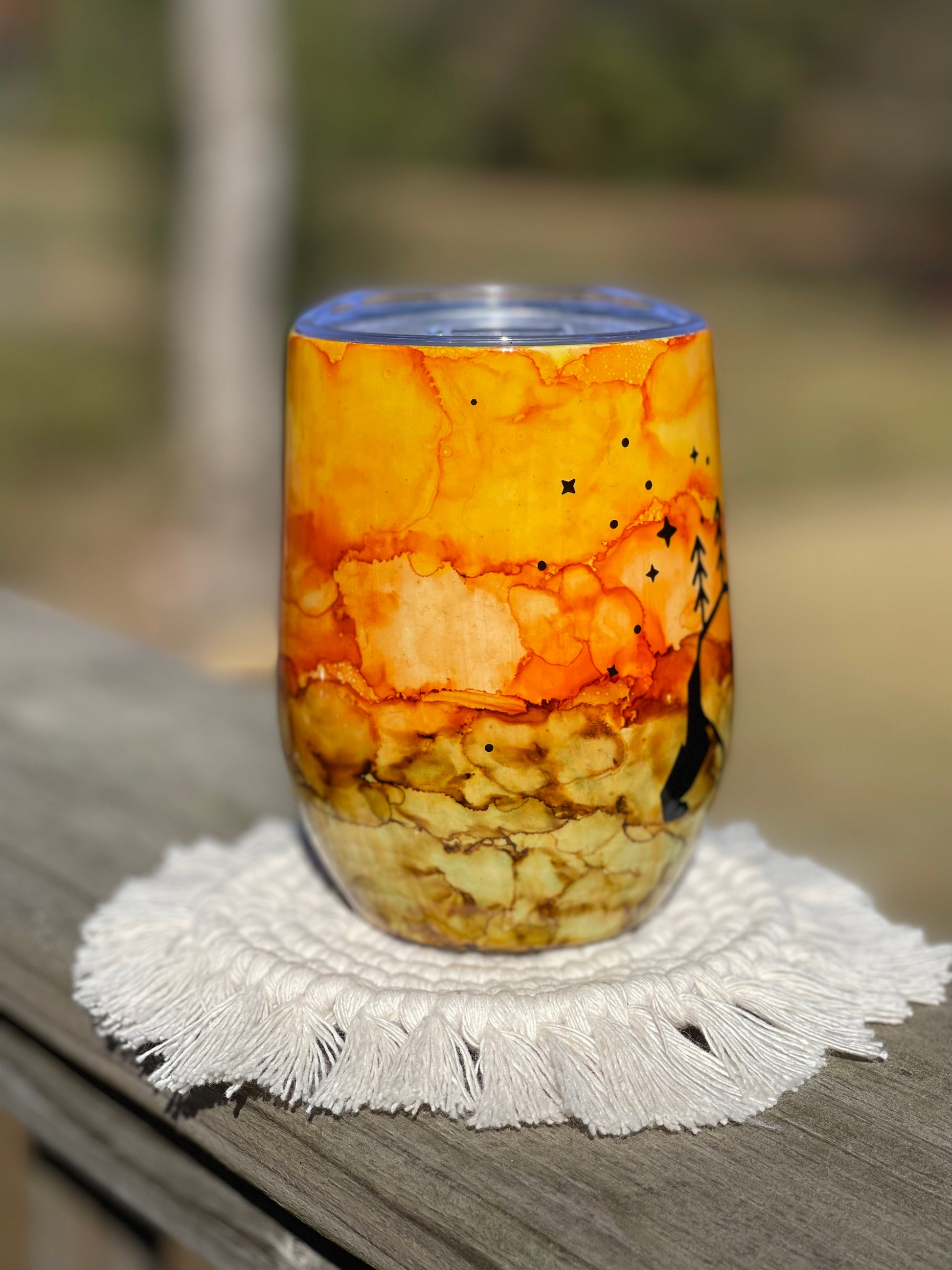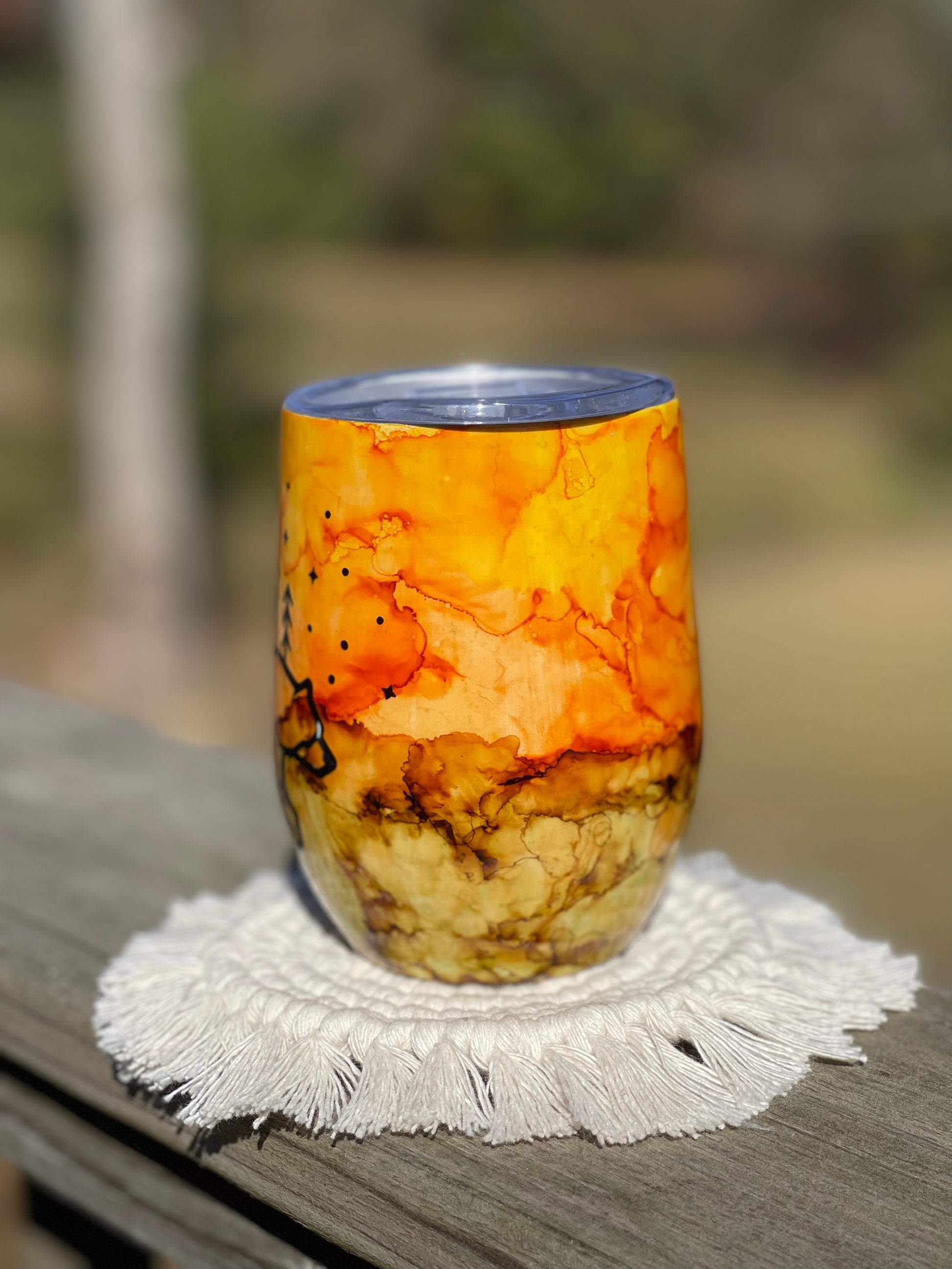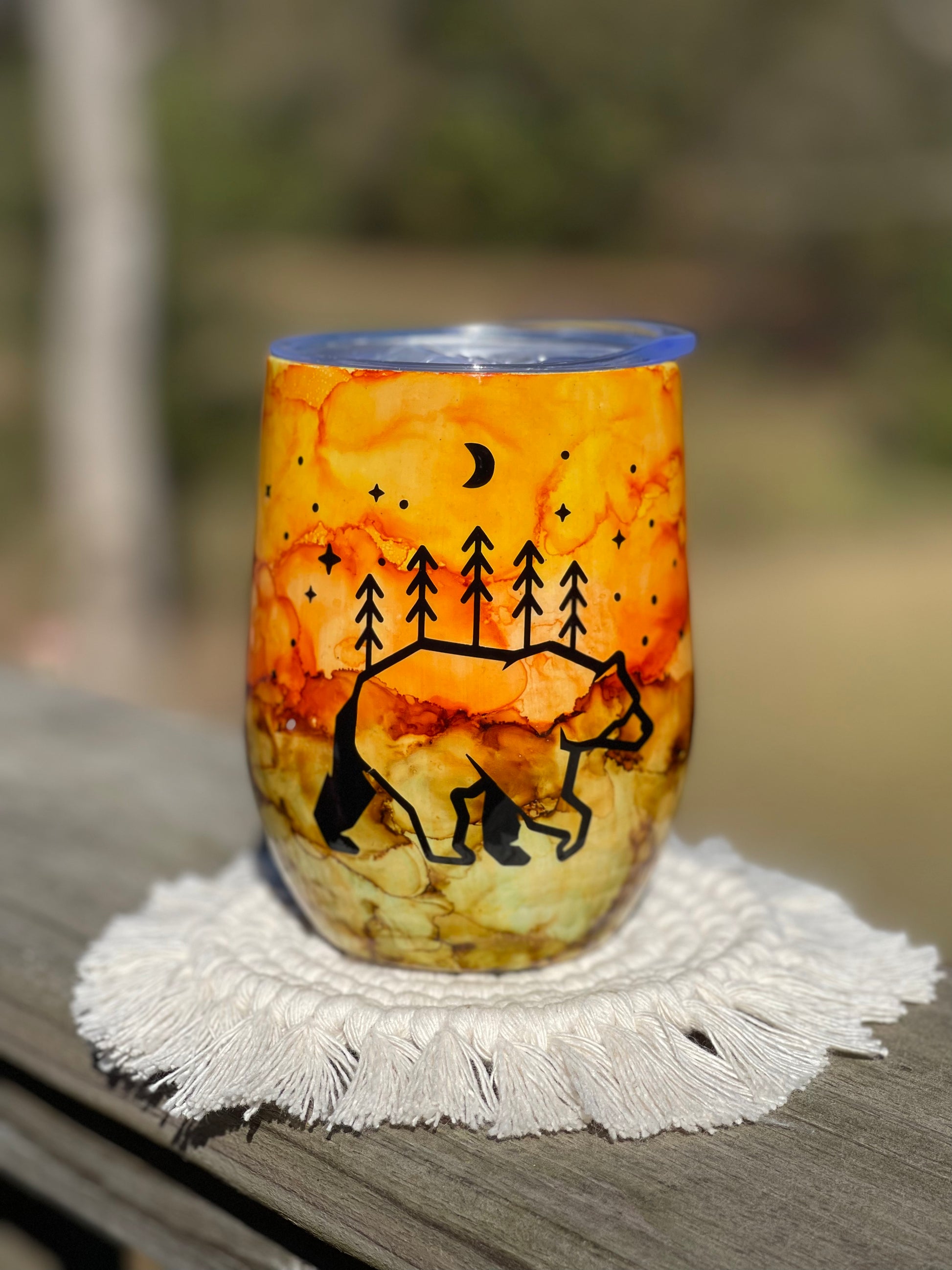 12 ounce wine tumbler with water colored ink style and bear decal. Stainless steel tumblers are made for hot and cold beverages.