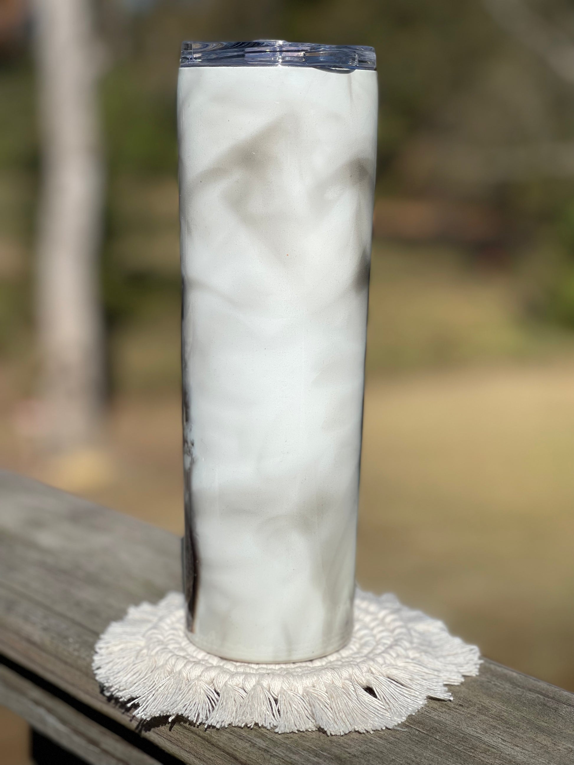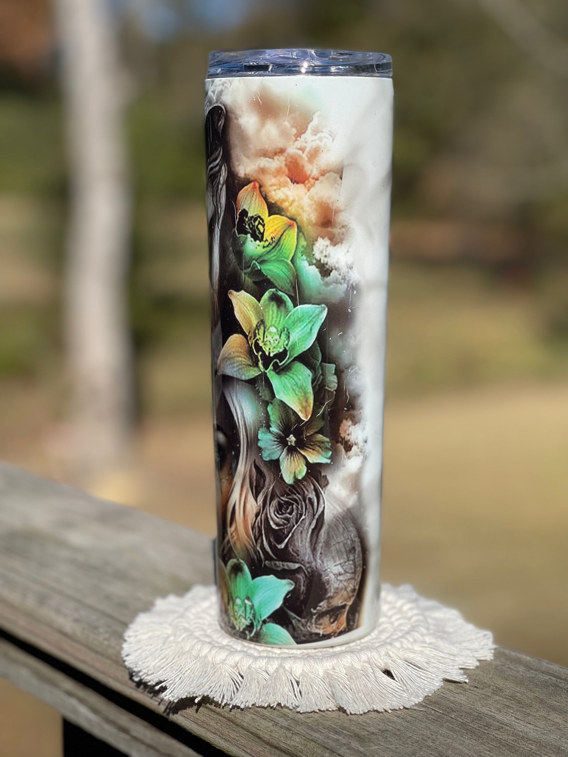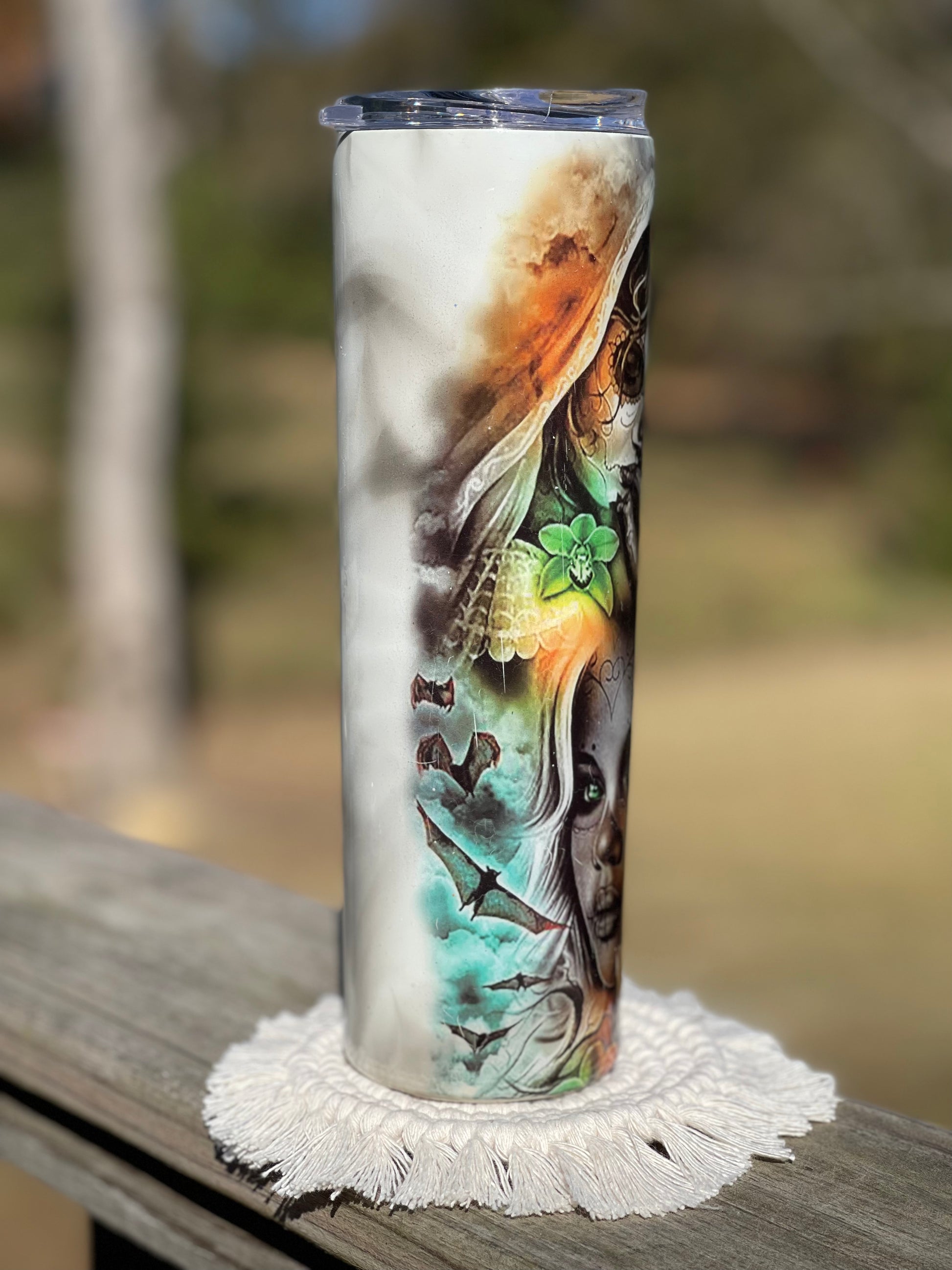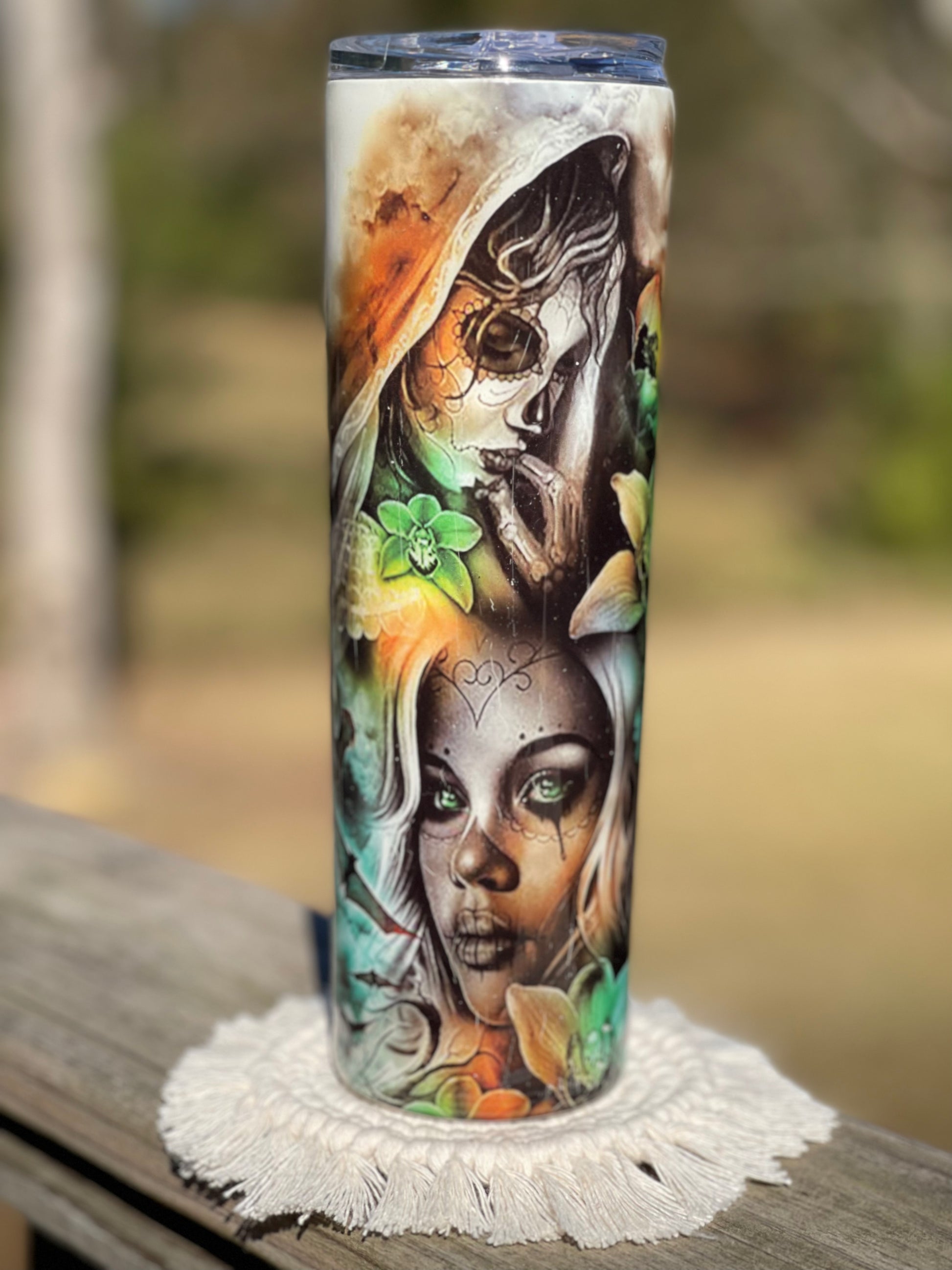 30 ounce skinny stainless steel tumbler with sugar skull images on a smoke effect background. Double walled stainless steel tumblers are made to hold hot or cold beverages.