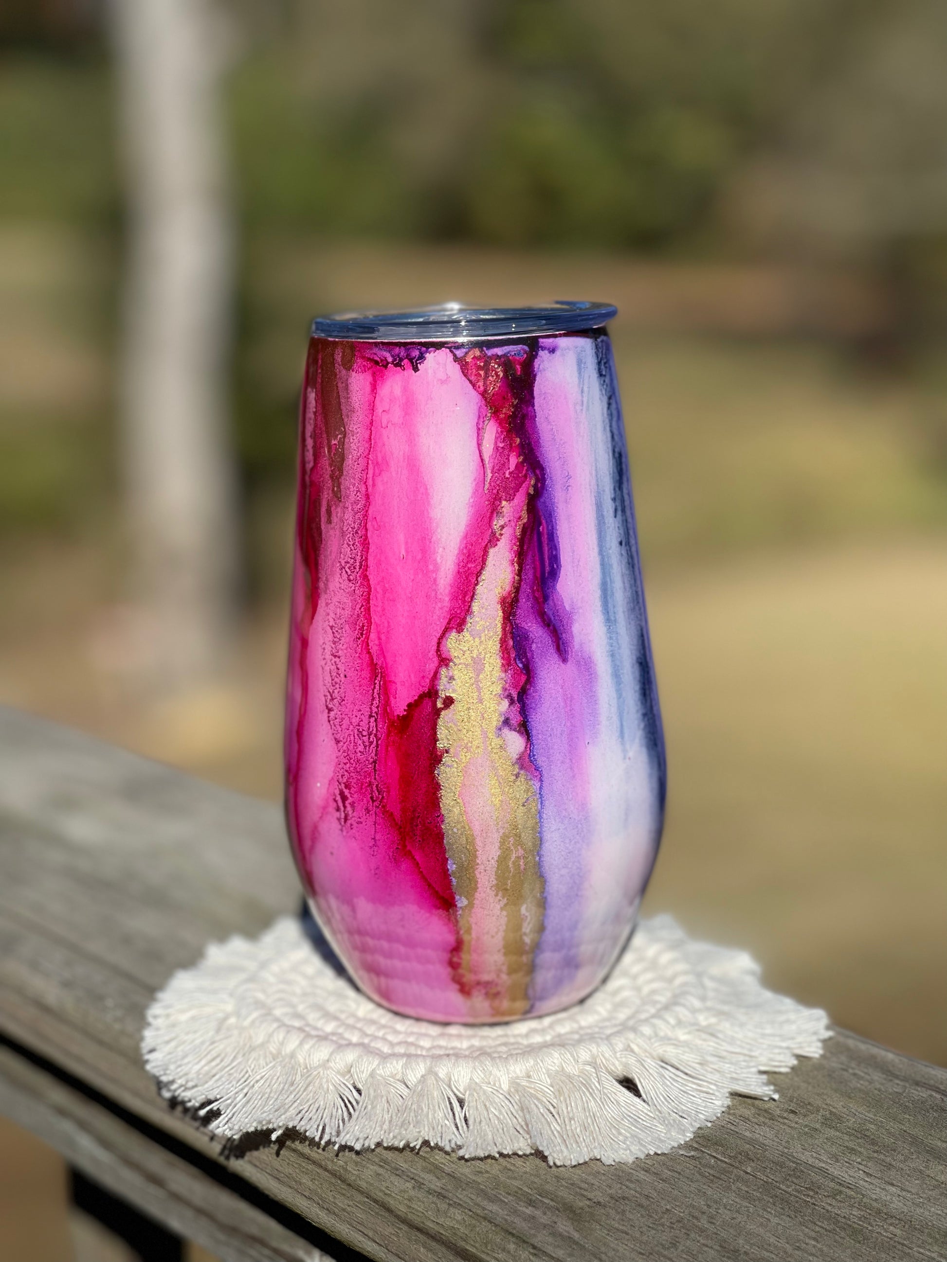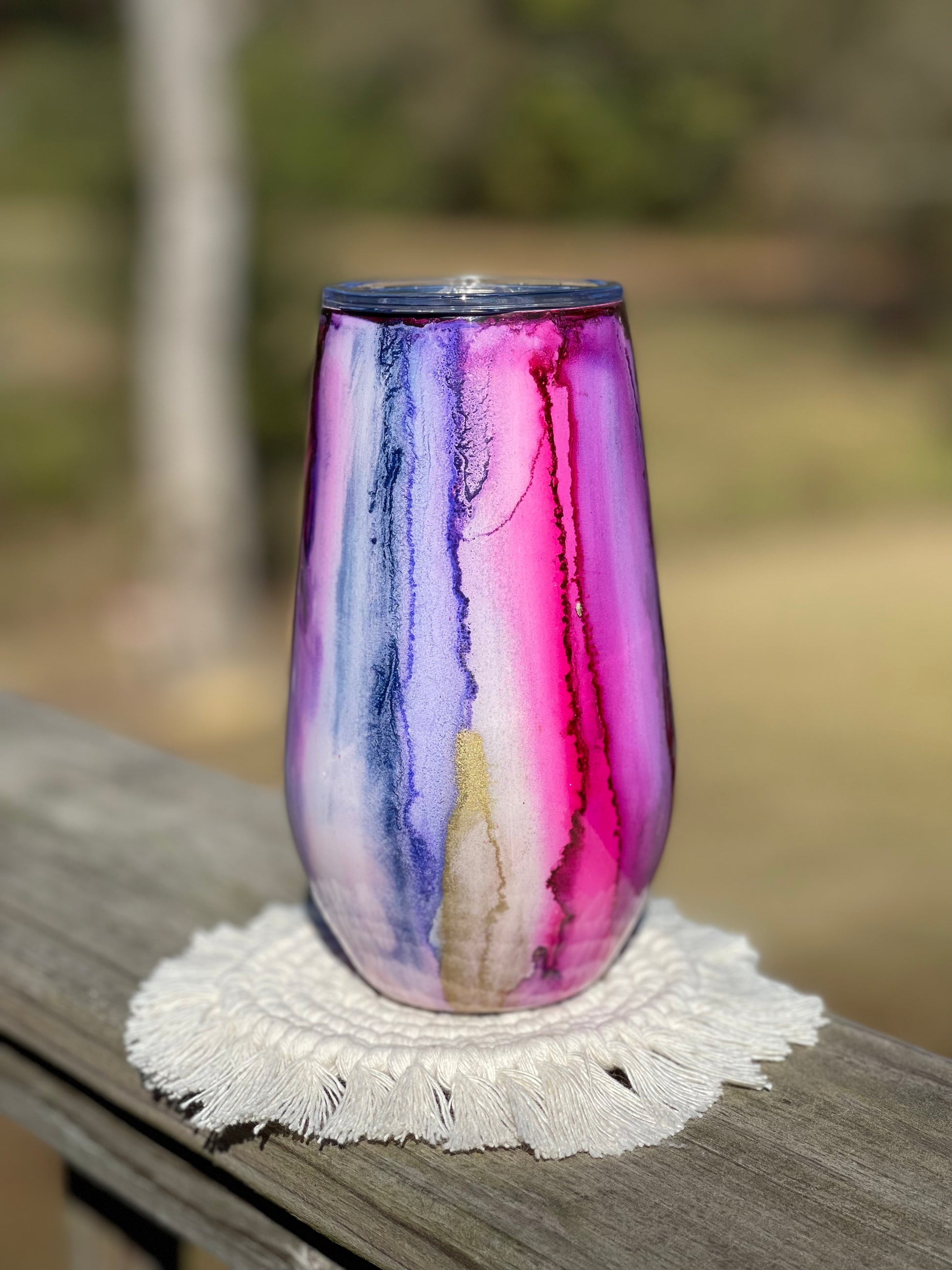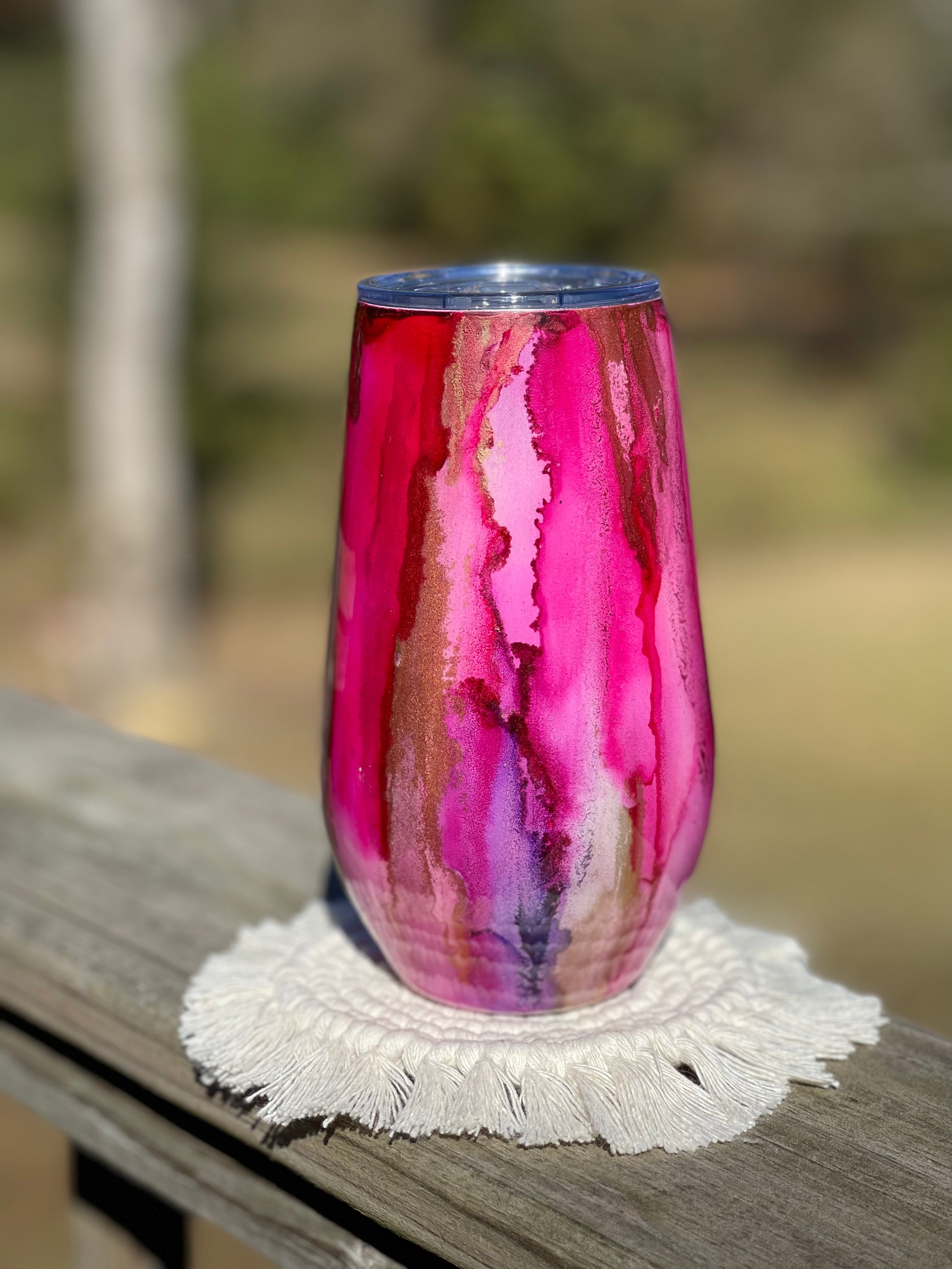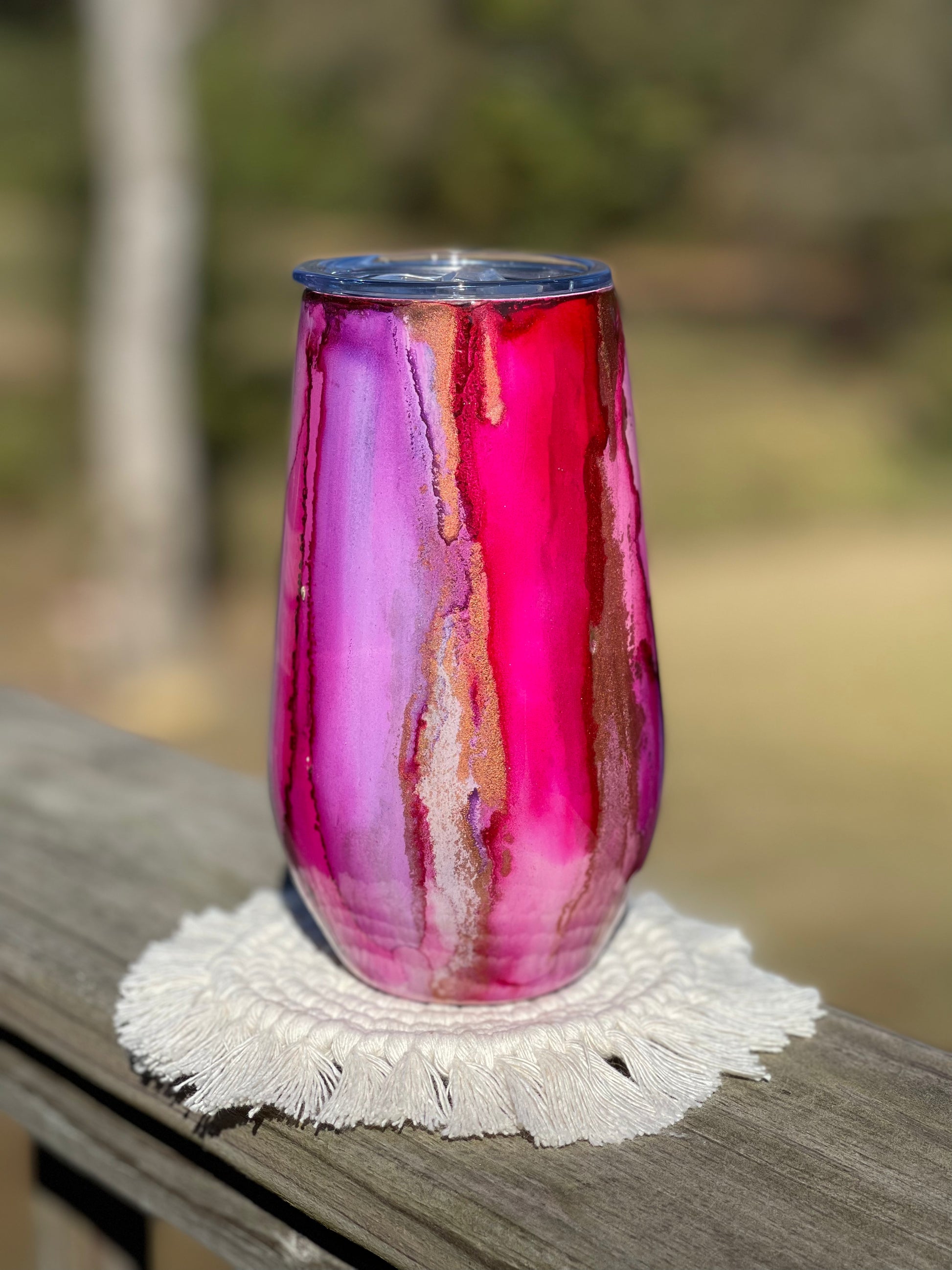 Rustic ink drop on a 16 ounce stainless steel tumbler. This style tumbler is great for wine, coffee, or whatever meets your fancy. Stainless steel tumblers are made to hold hot and cold beverages.